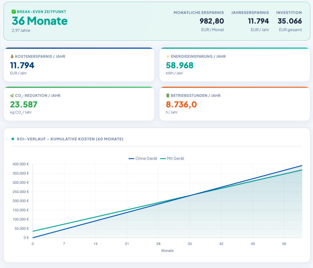 Stromersparnis in kWh, Kostenreduktion in €, CO₂-Einsparung und exakte Amortisationsrechnung.
