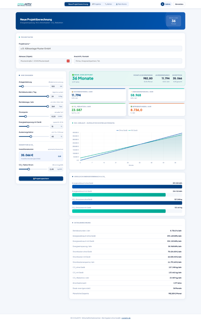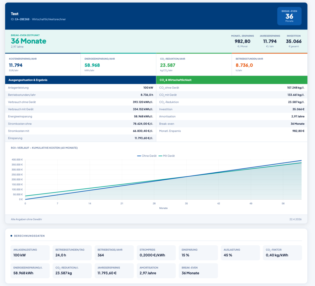 Einsparung, Amortisation, CO₂ — fertig für PDF.